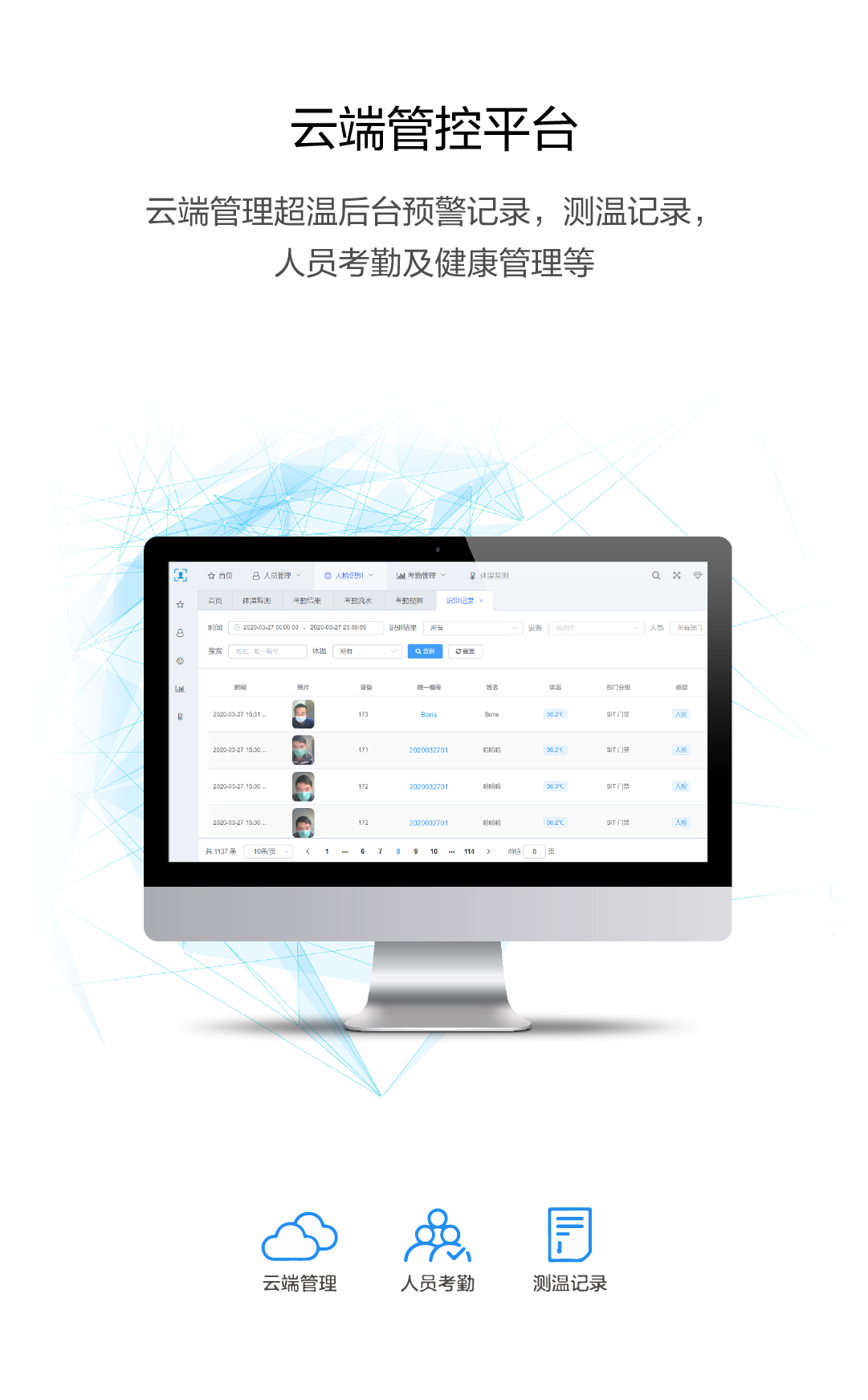 云端管理超温后台预警记录,测温记录,人员考勤及健康管理等